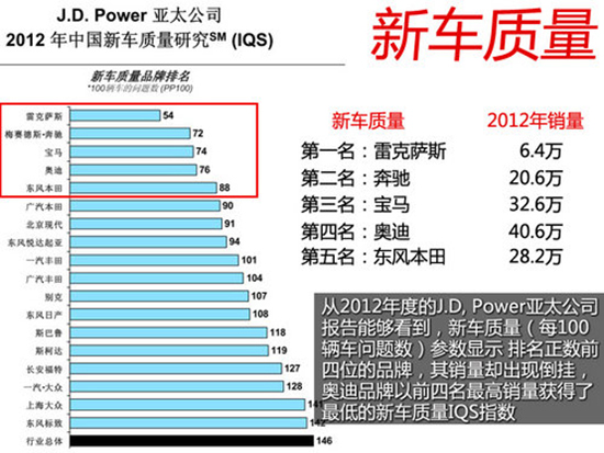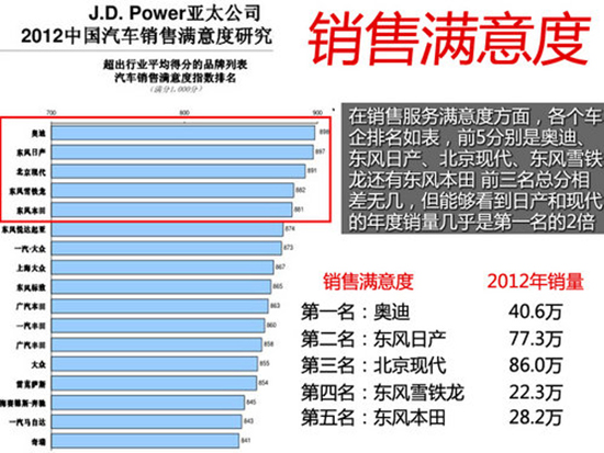 “国际消费者权益日”(International Day for Protecting Consumers' Rights)定于每年的3月15日,而每到这个时间,各大媒体、舆论平台都会曝光出很多行业事件与内幕。而我们也比对了权威调查机构J.D.Power2012年的调 查资料,其中包含了销售满意度调查、售后满意度还有新车质量指数,我们比对2012年全年的品牌销量,解析在这些参数的背后,有着怎样的问题。