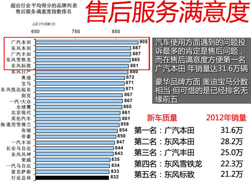 我们针对2012年全年的销量再次对比2012年度J.D.Power的中国新车质量研究(IQS)指数后发现,在新车销售满意指数排名前五名中的东风日产和东风雪铁龙品牌,在新车质量方面,东风日产降至第12名;而东风雪铁龙更是推出了榜单的角逐。 编辑点评 纵观2012年度的汽车市场,新车质量/销售环节/售后服务这三个大的汽车消费环节,表现出了极不相同的局面,消费者常常感到买车前是上帝,买车后求上帝的穿越窘境。培养用户忠诚,改善用户与企业间的关系才是长期可持续发展的良性循环关系。